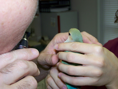 8 weeks old: Weaned. If you decide to clip, never clip a bird before they wean or they might not ever see a reason to get off the baby food. This is nature’s way: stop begging, get off Momma’s fat baby food, and fly! Even though socialization starts as early as two weeks, true socialization actually starts the week babies wean. Too many times we have seen and heard stories of birds that were handfed, but they turned wild. It happens during this week. The babies no longer need you as a source of food, so you need to show them that they still need you for other reasons: love, another source of fun, security, and socialization. During this week, most birds forgot you ever handfed them. All handfeeding does is that it gets a bird use to the presence of humans. So during the week your babies wean, the most important thing any of us can do is to continue a balance of training, positive reinforcement, cuddle time, and independent play. Why is a well-socialized parrot such an important goal? The simple answer is because they will live with people. If a bird is truly trust worthy, affectionate, and socialized, then chances are their humans will see them more than just birds in a cage, but as true family members. Thus, living a full and enrich life in a human household. Well-socialization goal: babies enjoy a great head rub and have first full vet check from an Avian Veterinarian.